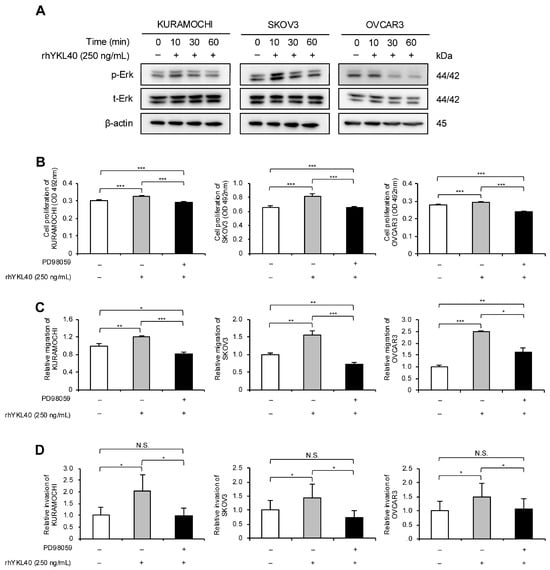 YKL40 promotes malignant phenotypes of EOC cells via the Erk pathway. (A): Time-dependent expression levels of Erk and p-Erk in EOC cells treated with rhYKL40 (250 ng/mL) were analyzed using Western blotting, with β-actin as control. (B–D): Changes in (B) proliferation, (C) migration and (D) invasion of EOC cells following rhYKL40 (250 ng/mL) treatment with or without MEK1/2 inhibitor (PD98059; 10 µM) were assessed using (B) MTS assay, (C) transwell migration assay, and (D) transwell invasion assay, respectively. Representative images of transwell migration and invasion assays are shown in Figure S2E,F, respectively. * p < 0.05, ** p < 0.01, *** p < 0.001. N.S., not significant. Furthermore, the original Western blotting images are provided as Figure S5A–D.