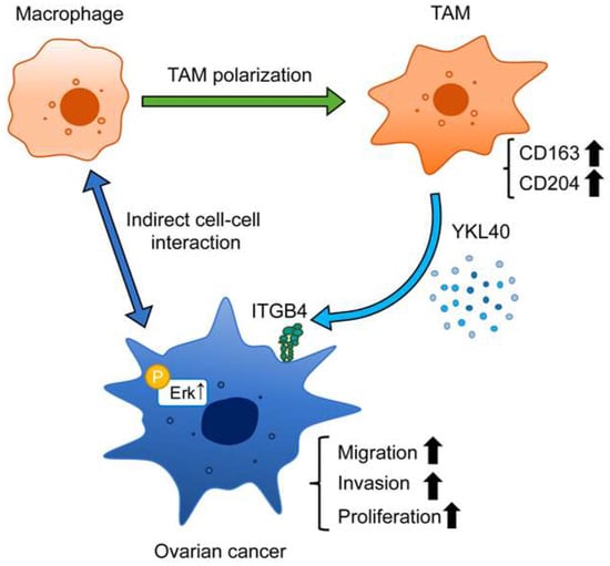 Schematic diagram illustrating the role of YKL40 in the EOC microenvironment. Indirect interactions with EOC cells lead to polarization of macrophages into TAMs. YKL40 is mainly secreted by TAMs. This activates the Erk pathway via ITGB4, promoting the migration and invasion of EOC cells.