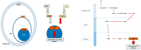Natriuretic peptide precursor C (NPPC) in mural granulosa cells and it’s receptor NPR2 in cumulus cells play a role in maintaining high levels of cAMP in oocytes, which keeps them arrested in the meiosis cycle. LH triggers oocyte maturation by activating phosphodiesterase (PDE3A), which downregulates cAMP levels, leading to oocyte maturation. Estradiol promotes NPR2 expression, maintaining oocyte meiotic arrest [28].
