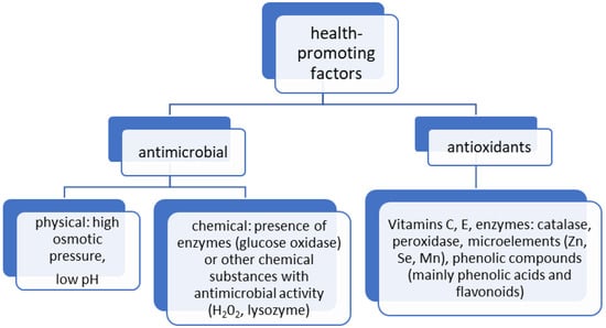 Honey, as a natural food product, is one of the most valuable components of the human diet. It is produced by bees, who enrich nectar and honeydew with their own secretions. It is a product of the highest quality, not obtainable by any other means []. Honey contains many biologically active substances that regulate digestive processes and heart function, as well as showing, among others, antimicrobial, anti-inflammatory, antidiabetic, antioxidant, and anti-tumoral effects []. These properties are closely related to the chemical composition of honey, with both volatile and non-volatile compounds responsible for them, including phenolic compounds, amino acids, enzymes, essential oils, and others [,,,,,,,]. However, such a rich and complex chemical composition of honey does not allow it to be considered as a strictly medicinal product. However, in recent years, many articles have appeared in the world literature describing the action of individual honey components at the molecular level. Generally speaking, these components can be divided into those with antimicrobial activity and those with antioxidant activity (Figure 1).