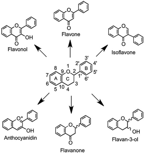 The largest and the most diverse group of honey phenolic compounds are flavonoids. More than 5000 flavonoids have been identified so far. They occur naturally in various plants, where they accumulate mainly in the leaves, flowers, fruits, and seeds. They have also been found in honey and propolis [,,,,,,]. Flavonoids rarely occur as free molecules, most often appearing in a bound form as glycosides rather than aglycones. Compounds included in this group are similar in terms of their chemical structure. Their distinguishing feature is a diphenylpropane skeleton (C6-C3-C6) with varying degrees of oxidation of the central pyran ring, while most types of flavonoids (except catechins and anthocyanidins) contain a flavone skeleton with a ketone group in position 4. Flavonoids differ in the number and type of substituents (hydroxyl, glycosidic residues, and methoxy groups). The differences between the compounds in individual classes usually result from the different structures of only one terminal ring (Figure 2) [,,]. This affects the properties and biological activity of individual groups of flavonoids.