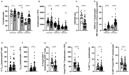 As shown in the Supplementary Figure S1, significantly decreased levels of the B lymphocytes (Figure S1A,B), a lower percentage of circulating iNKT cells (Figure S1C), no difference in the number of iNKT (Figure S1D), as well as in the percentage and amount of the circulating NK effectors (Figure S1E,F) were observed in the transplant recipients, in comparison with controls. Moreover, the comparative analysis of the growth ability of innate and adaptive lymphocytes between kidney recipients and controls revealed no significant difference in ki67 intracellular expression by CD4+ and CTL T cells (Figure S1G,H), or in B lymphocytes (Figure S1I) or NK effectors (Figure S1J).