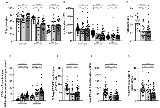 Allograft kidney recipients show association of highest level of circulating TR3-56 regulatory T cells with significant decrease in the Treg growth ability and increasing CD54 expression by the CD4+ T cell population. White columns indicate healthy controls; light and dark grey columns indicate transplanted subjects showing circulating TR3-56 levels <9.16% or ≥9.16% of the T cell population, respectively; the 9.16 cut-off value was obtained by increasing by three standard errors the median value observed in healthy controls (see patient and method section for details). (A,B) Indicate percentage and number of circulating T, CD4+ and CD8+ T lymphocytes; (C) Shows CD4/CD8 ratio; (D) Refers to CD54 expression level in CD4+ and CD8+ T lymphocytes; as detailed in Section 4, CD54 expression on the T cell effectors was expressed as a ratio of the mean intensity fluorescence (MIF) value for CD4+ and CD8+ T cells and the control MIF value obtained after staining the same cell populations with the isotype control mAb. (E,F) Indicate the percentage and number of the circulating Treg in the different cohorts; (G) Indicates the growth ability of the circulating Treg population, as represented by their intracellular expression of the ki67 molecule; Statistical evaluation of the data was performed by means of the Mann–Whitney test. Statistical significance values are indicated.