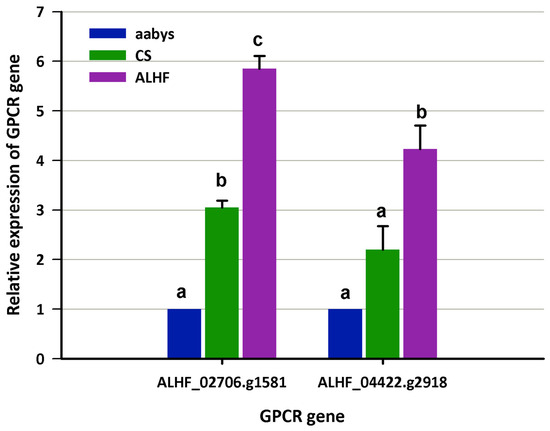 We compared the expression levels of these GPCR genes between the resistant ALHF strain and the susceptible aabys and CS strains. This approach was chosen to avoid false positive results that could arise from analyzing mosquitoes of different genetic backgrounds or inherent tolerances, rather than true resistance. qRT-PCR results confirmed that two GPCRs, ALHF_02706.g1581 and ALHF_04422.g2918, were significantly overexpressed in the ALHF-resistant strain compared to the two susceptible strains (Figure 1). Specifically, the relative expression levels of ALHF_02706.g1581 and ALHF_04422.g2918 were upregulated 5.9-fold and 4.2-fold, respectively, in ALHF compared to aabys, and 1.9-fold compared to the CS strain (Figure 1). These two GPCRs were the focus of further characterization to understand their roles in insecticide resistance in house flies.