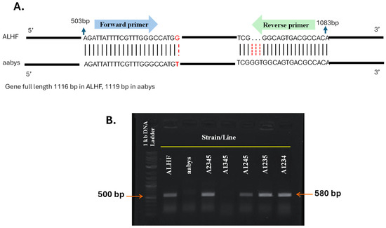 Validation of the autosomal location of the rhodopsin-like GPCR gene was further conducted using allele-specific PCR [19]. The rhodopsin-like GPCR gene ALHF_02706.g1581 was chosen for validation due to the presence of single nucleotide polymorphisms (SNPs) between the resistant ALHF strain and the aabys strain. In contrast, the ALHF_04422.g2918 gene showed identical sequences in both strains. The allele-specific PCR primers for the rhodopsin-like GPCR gene ALHF_02706.g1581 were designed based on the ALHF sequence, incorporating a specific SNP at the 3′ end of one primer to enable preferential amplification of ALHF alleles (Table 2, Figure 2A) [11,41]. Our results indicate that the ALHF allele-specific primer sets for ALHF_02706.g1581 successfully amplified specific DNA fragments (~580 bp) exclusively in flies carrying the wild-type autosome 2 markers from ALHF. No amplification occurred in flies homozygous for autosome 2 from either the aabys strain or the A1345 strain (Figure 2B).