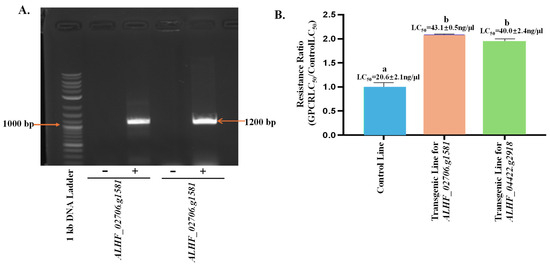 To characterize the function of the up-regulated genes ALHF_02706.g1581 and ALHF_04422.g2918 in the development of insecticide resistance in ALHF house flies, we conducted a transgenic study using the GAL4-UAS enhancer trap system in D. melanogaster. To confirm the presence of house fly rhodopsin-like GPCR genes in the transgenic Drosophila lines, we performed RT-PCR using full-length primer pairs for ALHF_02706.g1581 and ALHF_04422.g2918 (Table 1), and cDNA from three Drosophila lines: the control (F1 progeny of Bloomington stock #24484 D. melanogaster line containing an empty pUAST vector crossed with GAL4), transgenic ALHF_02706.g1581 (F1 progeny of homozygous transgenic ALHF_02706.g1581 crossed with GAL4), and transgenic ALHF_04422.g2918 (F1 progeny of homozygous transgenic ALHF_04422.g2918 crossed with GAL4). The results showed that the full lengths of ALHF_02706.g1581 and ALHF_04422.g2918 were only amplified in the ALHF_02706.g1581 and ALHF_04422.g2918 transgenic lines, respectively, with specific gene sizes ~1200 bp (Figure 3A), corresponding to the size of ~1200 bp for these two rhodopsin-like GPCR genes. Sequencing of the PCR products from these transgenic lines confirmed that they are indeed the full lengths of rhodopsin-like GPCR ALHF_02706.g1581 and ALHF_04422.g2918.