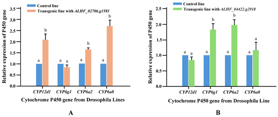 qRT-PCR was used to detect the relative expression levels of four Drosophila resistance P450 genes, CYP12D1, CYP6G1, CYP6A2, and CYP6A8 [42] in CK, ALHF_02706.g1581 and ALHF_04422.g2918 transgenic Drosophila lines. Female Drosophila, 2–3 days post-eclosion, were collected for the P450 gene expression analysis, following the same qRT-PCR method described previously. The primers used for the PCR reactions for CYP12D1, CYP6G1, CYP6A2, and CYP6A8 are listed in Table 1.