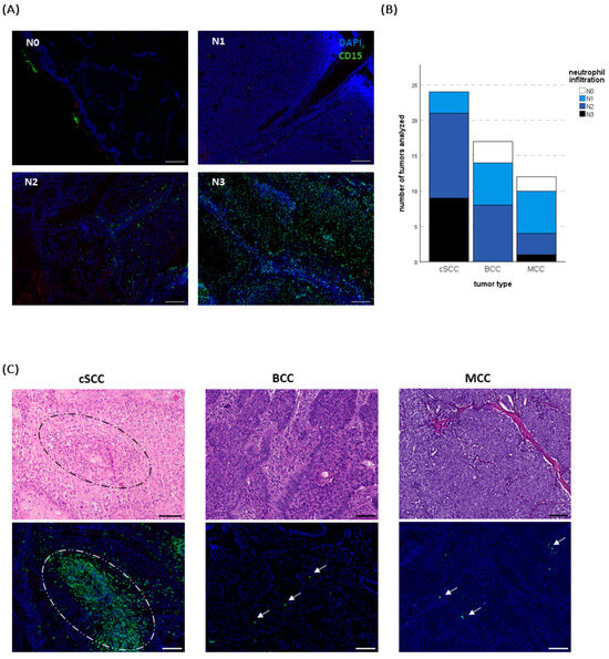 (A) Exemplary pictures of different neutrophil scores (N0–N3) assessed by immunofluorescence (IF) staining. CD15 (green) was used as a granulocyte marker, and DAPI (blue) served as counterstaining. Scale bars 200 µm. (B) Overview of the analyzed tumor specimens and the detection of neutrophils. (C) Representative H&E as well as respective IF images of a cutaneous squamous cell carcinoma (cSCC), a basal cell carcinoma (BCC), and a Merkel cell carcinoma (MCC) (single neutrophils indicated by arrows). Several of the cSCCs showed a high infiltration, in part with a swarming behavior (dotted circle) which was exclusively present in cSCCs. Scale bars 100 µm.