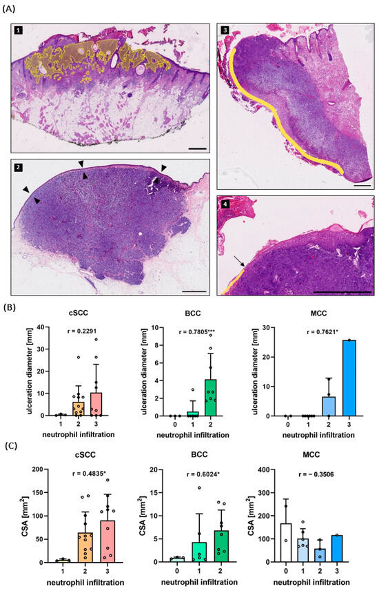 (A) (1) Representative H&E staining of a BCC. Tumors were annotated manually on the scanned slides and the cross-sectional area (CSA) was calculated with the open-source software QuPath 0.4.3. (2) A non-ulcerated MCC. If an intact epidermis (arrowheads) could be distinguished throughout the whole sample, the specimen was labeled as non-ulcerated. (3) and (4) Overview and close-up of an ulcerated cSCC. Ulceration (yellow line) was defined as a discontinuity of the epidermis (start indicated by arrow). Scale bar 1000 µm. (B) In BCC and MCC the neutrophil score given in the immunofluorescence staining correlated significantly with the ulceration diameter. In cSCC, no correlation was found. (C) In cSCC and BCC, but not in MCC, the neutrophil infiltration correlated significantly with the CSA. Bars indicate mean + standard deviation (SD). r = Spearman’s ρ. * p < 0.05, *** p < 0.001.