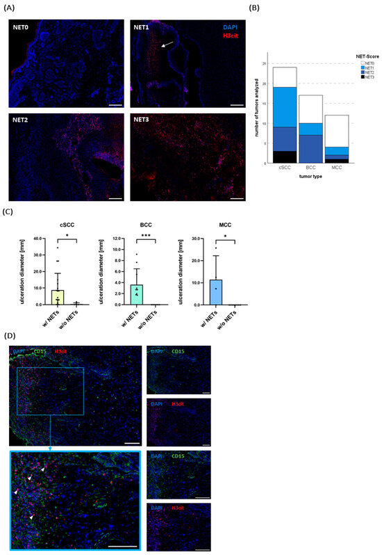 (A) Exemplary pictures of different neutrophil extracellular traps (NET) scores (NET0–NET3) assessed by immunofluorescence staining. H3cit (red) indicates NET formation. DAPI (blue) served as counterstaining. NET0: A non-ulcerated BCC with no NETs. NET1: An ulcerated BCC with some infiltration by NETs. In BCCs, they typically could be distinguished in the scab (arrow) and in the ulceration zone. NET2: An ulcerated cSCC with medium NET infiltration. NET3: An ulcerated cSCC with extensive NET infiltration. Scale bar 200 µm. (B) Overview of the analyzed tumor specimens and the detection of NETs. (C) The presence of NETs was associated with a significantly larger ulceration diameter across all entities. Bars indicate mean + SD. (D) Representative immunofluorescence images of a cSCC with a neutrophil score of N3 and a NET score of NET3. CD15 (green) was used to stain granulocytes. Small images show CD15 (green) and H3cit (red) channels separately. Towards the ulceration, disintegrating granulocytes can be distinguished that, in part, expulse NETs (examples shown by arrowheads). Scale bars 100 µm. * p < 0.05, *** p < 0.001.