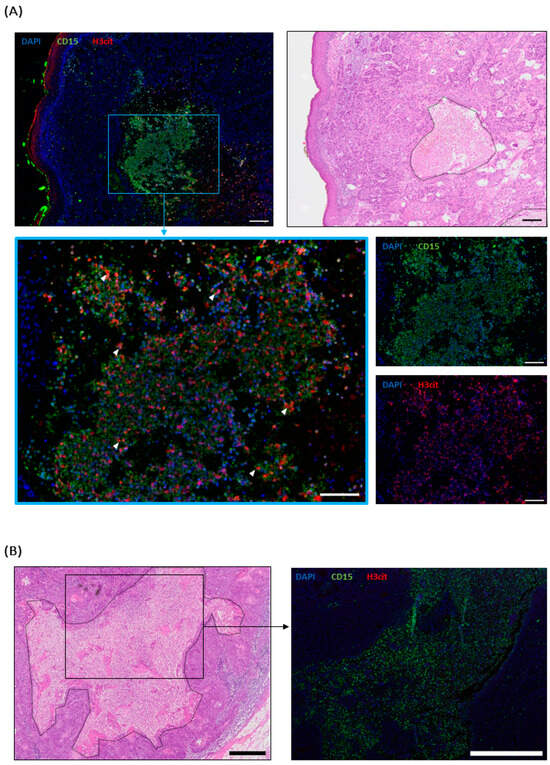 H&E and the respective immunofluorescence (IF) images of exemplary stained cSCC and MCC metastases. CD15 (green) was used as a granulocyte marker, H3cit (red) visualized NETs, and DAPI (blue) served as counterstaining. Necrotic areas are surrounded by dotted lines. (A) A necrotic cutaneous cSCC metastasis. Scale bar 200 µm. Enlarged section: Neutrophils in the necrotic area expulse NETs (examples indicated by arrowheads). Scale bar 100 µm. (B) A necrotic lymph node, highly infiltrated by neutrophils (green), but without NETs. Scale bar 1 mm.