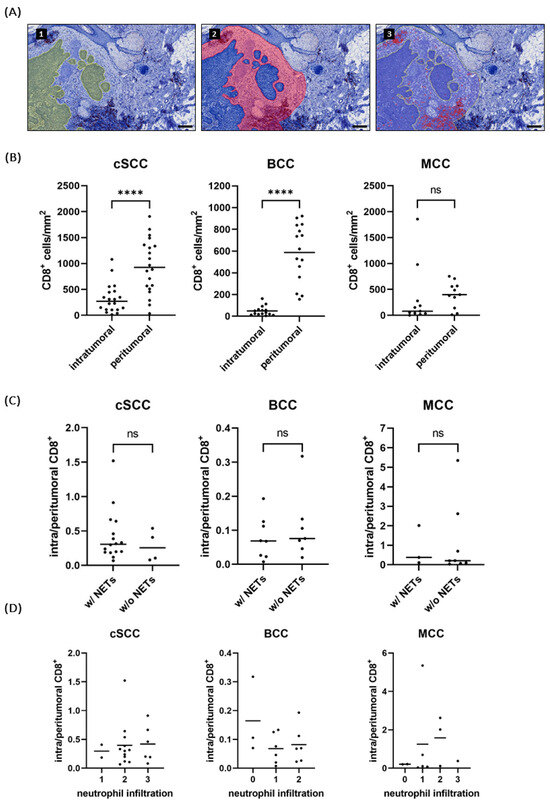 Intra- and peritumoral CD8+ T cells were counted via immunohistochemistry and the open-source Software QuPath 0.4.3. (A) The tumor (1, green area) was annotated manually and a 300 µm rim (2, red area) was defined as the peritumoral region. Positive cells (3, red dots) were counted with the Positive Cell Detection command. The CD8+ T-cell density quotient was calculated by dividing the intratumoral CD8+ T cell density [cells/mm2] by the peritumoral CD8+ T cell density [cells/mm2]. Scale bar 200 µm. (B) In BCC and cSCC, significantly more CD8+ T cells were detected in the peritumoral area than inside the tumor. (C,D) No difference in the CD8+ T cell density quotient was seen in specimens that contained NETs and those that did not, nor in specimens with different neutrophil infiltration densities. **** indicates p < 0.0001, ns = not significant.