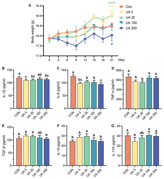 2.1. Effect of UA on Immune-Related Cytokines in Mice