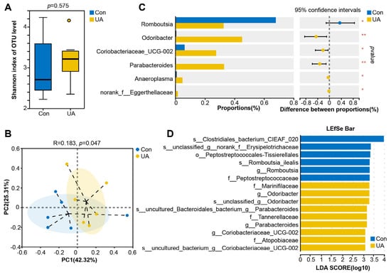 2.3. UA Changes the Composition and Structure of the Gut Microbiota in Mice