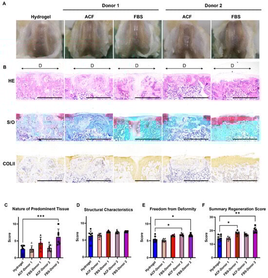 FBS-MSCs from both donors showed obvious hyaline cartilage regeneration, with the defect area repaired with tissues composed mainly of COLII and aggrecan deposition (Figure 1B). The FBS-MSC groups augmented tissue repair with an overall modified O’Driscoll score that was significantly higher than the Hydrogel group (Figure 1C,F). In contrast, implantation with ACF-MSCs from both donors did not yield improvement relative to the Hydrogel group.