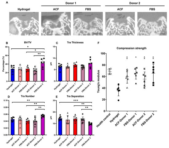 Although no significant structural improvement was found for the other three groups, the compression strength test revealed functional enhancement of regenerated tissues for all four MSC-transplanted groups compared with the hydrogel control. Furthermore, 2/6 of ACF-Donor 1, 2/6 of FBS-Donor 1, 1/6 of ACF-Donor 2, and 3/6 FBS-Donor 2 showed strength comparable to that of the healthy control.