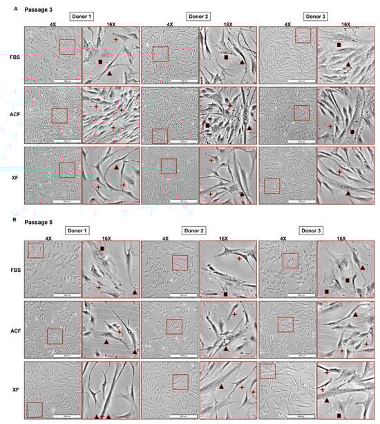 Morphology of MSCs at Passage 3 (P3) and Passage 5 (P5). (A,B) Cell morphology at P3 and P5, respectively; cell confluency at 50–60%, scale bar = 500 µm. ✦: small star-shaped MSC (RS); ▲: long-fibroblast-like spindle-shaped MSC (SS); ■: flattened cuboid-shaped MSC (FC).