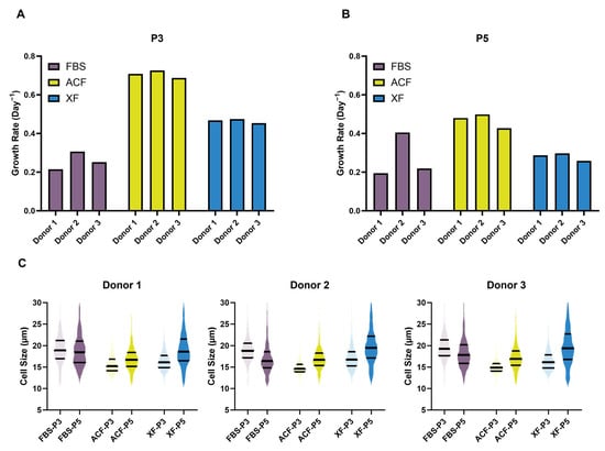 MSC growth rates and suspension cell size. (A,B) Growth rate at P3 and P5, respectively. (C) MSC suspension cell size, median, and quartile cell size are indicated by the black line.