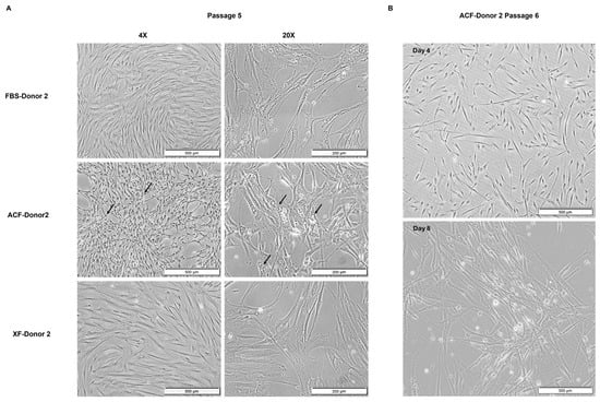 Abnormality in cellular morphology for ACF-MSCs, represented by Donor 2 cells. (A) P5 MSC morphology at 60–90% confluency. ACF-MSCs typically showed large vesicle formation. (B) P6 ACF-MSCs on day 4 and day 8, magnification = 4×. Black arrow indicates vacuolar structures.