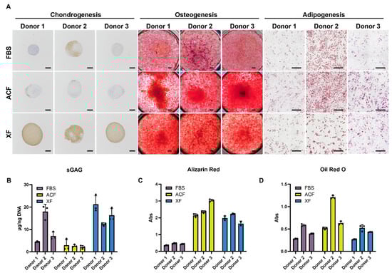 For chondrogenesis, within the FBS group, Donor 2 showed moderate chondrogenic differentiation with partial COLII staining in the tissue pellet (Figure 6A). ACF-MSCs performed poorly in chondrogenesis differentiation, with the absence of COLII expression (Figure 6A) in all three donors. On the contrary, the XF medium enhanced the MSC chondrogenesis potential in all three donors with full COLII expression (Figure 6A). These trends were also reflected in the formation of sulfated glycosaminoglycans quantification (sGAG) (Figure 6B).