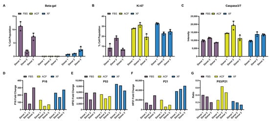 For apoptosis, the ACF group showed increased caspase 3/7 expression. Although no significant change in P53 and P21 was detected at P5, compared with the FBS group, an elevated P53/P21 ratio was observed in Donors 2 and 3 (Figure 7E). The caspase 3/7 expression in XF-MSCs was similar to FBS-MSCs. Although P53 and P21 were elevated at P5, the P53/P21 ratio was lower (Figure 7E–G).