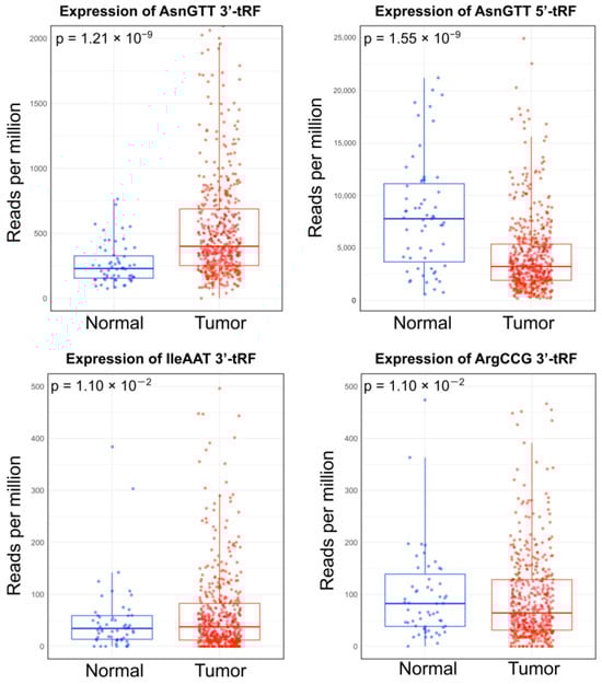 AsnGTT 3′-tRF was found to be significantly upregulated in cancer samples (log2FC = 1.20 × 100), while AsnGTT 5′-tRF, ArgCCG 3′-tRF, and IleAAT 3′-tRF were found to be significantly downregulated in cancer samples (log2FC of −9.41 × 10−1, −7.91 × 10−1, and −1.00 × 100, respectively). AsnGTT 3′-tRF also had the lowest p-value after adjustment (p = 1.21 × 10−9), with AsnGTT 5′-tRF having the second lowest (p = 1.55 × 10−9). Comparatively, ArgCCG 3′-tRF and IleAAT 3′-tRF had higher, identical p-values after adjustment (p = 1.10 × 10−2).
