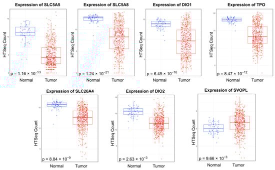 Similarly, differential expression of 22 THCA driver genes was analyzed between PTC and normal tissue samples, revealing seven dysregulated genes: SLC5A5, SLC5A8, SLC26A4, DIO1, DIO2, TPO, and SVOPL (Figure 2). All p-values were adjusted using the Benjamini–Hochberg correction method and filtered for p < 0.05. SVOPL was the only gene found to be upregulated in cancer samples; all other dysregulated genes were downregulated in PTC tissue samples (Table 1).