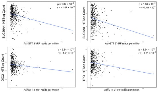 To characterize the relationship between the expression of dysregulated tRFs and dysregulated genes, Spearman’s rank correlation coefficient was calculated. In accordance with the hypothesis that a tRF-assisted RISC can knockdown mRNA transcripts, pairings were selected for significant anticorrelated expression (r < 0, p < 0.05), where greater tRF expression was associated with lower gene expression. All p-values were adjusted using the Benjamini–Hochberg correction method. We found four pairs consistent with this trend (Figure 3). Notably, all pairs involved AsnGTT 3′-tRF, an upregulated tRF, with downregulated genes (SLC26A4, SLC5A8, TPO, and DIO2).