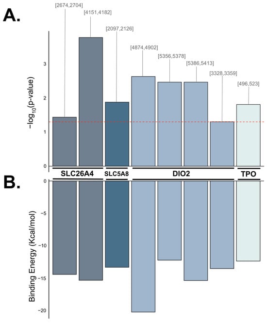 Binding affinity between anticorrelated tRF-gene pairs was predicted using base pair complementarity. Bar plots depicting each instance of predicted binding between tRF-30-RY73W0K5KKOV (AsnGTT 3′-tRF) and the target gene (SLC26A4, SLC5A8, DIO2, and TPO). (A) shows the negative logarithm of the test statistic and the target region’s start and end position in brackets. The dotted red line indicates the benchmark for statistical significance (−log(0.05)). (B) depicts the corresponding binding energy predicted to be released by the heteroduplex in Kcal/mol.