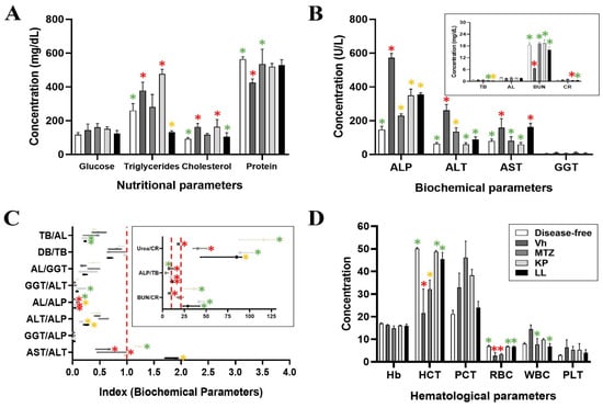 Paraclinical analyses of blood and serum from the five groups of hamsters. Nutritional parameters (A), biochemical parameters (B), ratios (C), and hematological parameters (D) were evaluated (for details, see Table S1). The results are presented as the mean ± standard deviation (A,B,D) or the median and range (C) of two biological replicates (n = 5). * p ≤ 0.05 vs. the control group by analysis of variance (red for the disease-free group, green for the Vh group, and yellow for both groups). Metronidazole (MTZ) was used as a positive control, vehicle (Vh, 1× phosphate-buffered saline, no treatment) was used as a negative control, and disease-free (without ALA) was used as a normal control. ALP, alkaline phosphatase; ALT, alanine aminotransferase (GPT); AST, aspartate aminotransferase (GOT); GGT, gamma glutamyl-transpeptidase; TB, total bilirubin; AL, albumin; BUN, blood urea nitrogen; CR, creatinine; DB, direct bilirubin; Hb, hemoglobin (g/dL); HCT, hematocrit (%); PCT, plateletcrit (%); RBC, red blood cells (×106/mm3); WBC, white blood cells (×100/mm3); PLT, platelets (×106/μL).