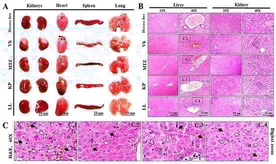 The neutrophil/lymphocyte ratio is a reliable predictor of systemic inflammation and poor prognosis associated with complications from a pyogenic liver abscess [44]. The Vh group presented the highest neutrophil/lymphocyte ratio (2.2 ± 1.4), followed by the KP (1.67 ± 0.8), LL (1.66 ± 1.26), disease-free (1.30 ± 0.15), and MTZ (1.15 ± 0.7) groups. The similarities between the treatment groups rule out possible serious inflammatory processes and sepsis (p ≥ 0.05, ANOVA followed by the Tukey test). The MTZ group also presented a clinical picture of moderate anemia, similarly to what was observed for the Vh group, possibly due to side effects related to the treatment itself (p ≤ 0.05, ANOVA followed by Dunnett’s test) (Figure 2D) [42].