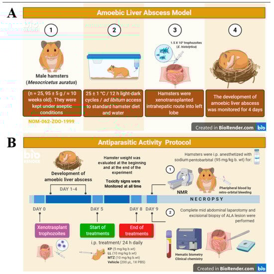 Timeline of the amoebic liver abscess model (A) and antiparasitic activity protocol (B) implemented for KP and LL. The antiprotozoal activity of kaempferol (KP) and linearolactone (LL) was determined in Entamoeba histolytica trophozoites xenotransplanted into the livers of male Mesocricetus auratus (Syrian hamsters), according to the protocol proposed by Tsutsumi et al. [18] and the Official Mexican Regulations (NOM-062-ZOO-1999) [72]. Figure created in BioRender by Talamas-Rohana, P. (accessed on 14 September 2024).