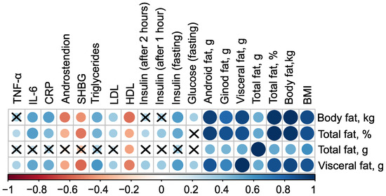 Correlation plot of body composition and clinical parameters in the control () and PCOS () groups before therapy. Cross sign marks statistically insignificant () relationship. The size of the dots associate with absolute value of correlation coefficient: stronger relationship—larger dots.