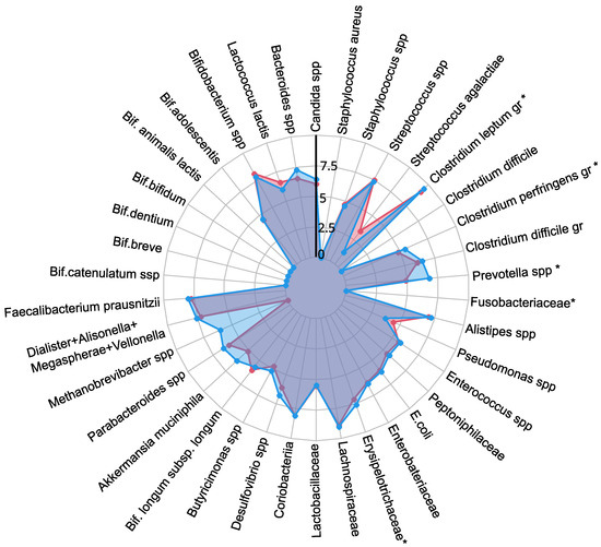 The influence of PCOS on gut microbiota before treatment, presented as a a radar chart (logarithmic scale) with median values of the number of colony-forming units: PCOS (red color, ) and control group (blue color, ). The data represent the average estimate of the of fecal real-time polymerase chain reaction (PCR) target genetic amplicon copy numbers in 1 g of feces. Statistically significant alterations () are indicated by an asterisk (*).