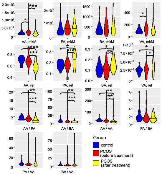 Violin plots for SCFA concentrations, relative abundances, and ratios (feces). Blue: the control group (); red: the group with PCOS before treatment (); yellow: the group with PCOS after treatment (). AA: acetic acid; VA: valeric acid; BA: butyric acid; PA: propionic acid. * denotes , ** denotes , and *** denotes , according to the Mann–Whitney test.