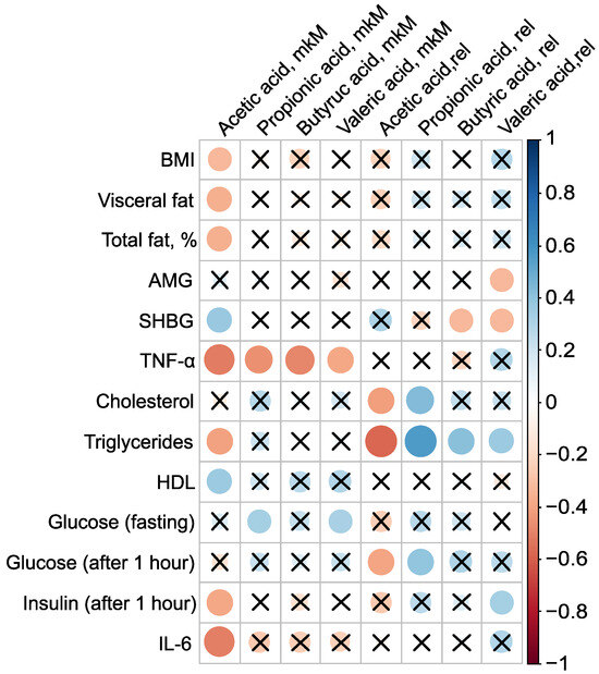 Clinically relevant parameters in the PCOS group () and their statistically significant associations with serum SCFAs before metformin therapy. Cross sign marks statistically insignificant () relationship. The size of the dots associate with absolute value of correlation coefficient: stronger relationship—larger dots.