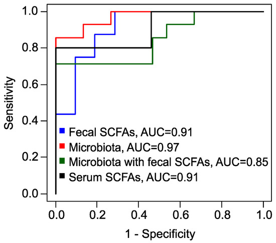 When an xGBoost model combined levels of fecal SCFAs and microbiota features (Figure S5a,b), it maintained a perfect sensitivity of 100%, but once again, specificity was lower at 71%.