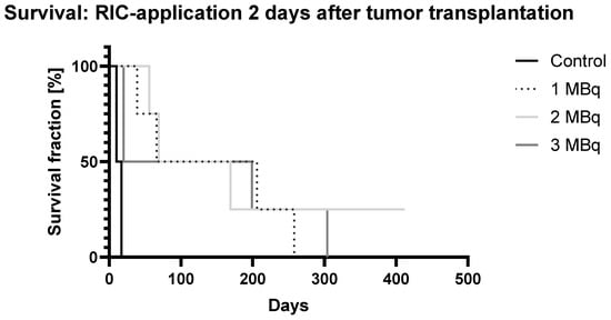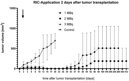 Clear signs of accelerated tumor growth in the control group, compared to all therapy groups, became evident six days after RIC administration in the group where RIC was applied two days after tumor transplantation. However, statistical significance was only confirmed for the 3 MBq group (p = 0.0468) using the Kruskal–Wallis test. Similarly, on day 11 post administration, statistical significance was only demonstrated in the 1 MBq group (p = 0.02).