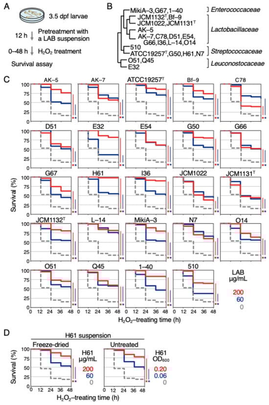 Effects of pretreatment with LAB on the survival rates of zebrafish larvae exposed to H2O2. (A) A schematic diagram of the assay. Twenty 3.5 dpf larvae were placed into a 3 cm dish, pretreated with LAB suspension for 12 h, then exposed to 2.0 mM H2O2 for 48 h, and the survival rates of the exposed larvae were measured every 12 h. (B) Phylogenetic evolutionary tree of LAB strains used in this experiment. ATCC: American Type Culture Collection, JCM: Japan Collection of Microorganisms. (C) Antioxidant activity in suspensions of 24 LAB strains. 3.5 dpf larvae were pretreated with suspensions of the indicated LAB strains at concentrations of 0 (dotted gray), 60 (blue), or 200 µg/mL (red). After pretreatment for 12 h, the solution was replaced with 2.0 mM H2O2, and survival was measured every 12 h for 48 h. Each analysis was performed in duplicate, and the total number of tested larvae was more than 60 in each case (N > 60). (D) Comparison of the antioxidant activity of freeze-dried and non-freeze-dried samples. A total of 3.5 dpf larvae were pretreated with suspension of the strain H61 at indicated concentrations. After pretreatment for 12 h, the solution was replaced with 2.0 mM H2O2, and survival was measured every 12 h for 48 h. Each analysis was performed in quadruple (N > 130). Asterisks indicate p values of <0.01, which are considered statistically significant. OD600: optical density at 600 nm.