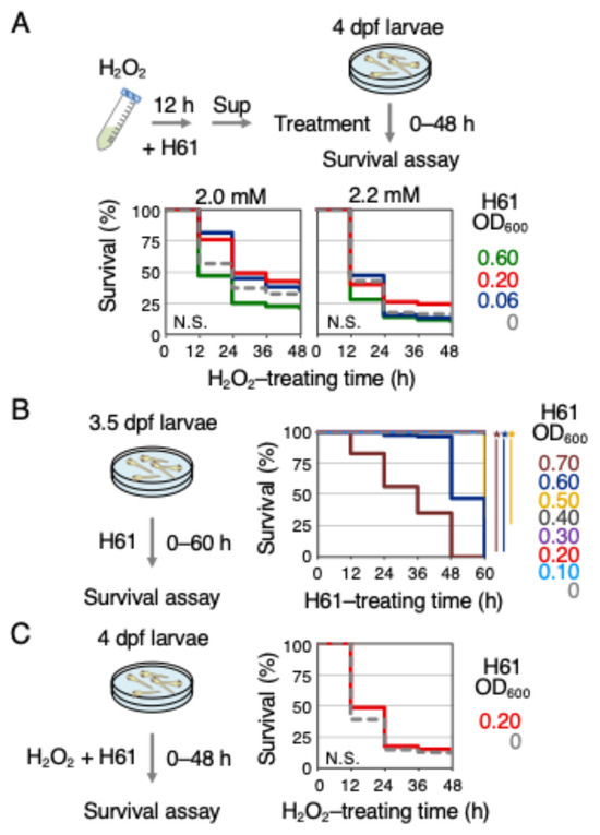 It is known that live LAB has direct antioxidant activities [20,21]. Despite being heat-killed, the antioxidant activities observed in the experiments might include not only indirect but also direct antioxidant activities. If H61 has direct antioxidant activity, pretreating H2O2 with H61 should reduce the lethality of H2O2 for the zebrafish larvae. Therefore, the lethality of H2O2 pretreated with H61 for 12 h in vitro was compared to that of untreated H2O2 on 4 dpf larvae (Figure 2A). As a result, 59% and 65% of 4 dpf zebrafish larvae exposed to H2O2 (2.0 mM) pretreated in vitro with H61 (0.20 and 0.06 OD600, respectively) died after 48 h of treatment. These mortality rates were not significantly different from those observed in larvae exposed to H2O2 alone (69%), suggesting that the H61 treatment had no effect. Considering the possibility that the direct antioxidant activity might be smaller than the indirect activity, the concentration of H61 was increased to 0.60 OD600 for analysis, but the same result (79%) was obtained. To be thorough, the effects were also analyzed at a concentration of 2.2 mM H2O2, but similar results were observed. Briefly, 90%, 77%, 88%, and 84% of larvae exposed to H2O2 pretreated with H61 (0.60, 0.20, 0.06, and 0 OD600, respectively) died after 48 h of treatment. These observations suggest that the heat-killed H61 suspension does not have direct antioxidant activity.