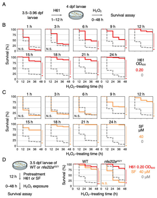 The pretreatment time required for strain H61 to exhibit its antioxidant activity was next examined (Figure 3A). The start time of H61 pretreatment was gradually delayed, starting at 3.5 dpf with a 12 h pretreatment and reducing it to as much as 3.96 dpf with a 1 h pretreatment. At 4 dpf, H61-pretreated larvae were exposed to H2O2, and their survival was analyzed (Figure 3B). As a result, no antioxidant activity was observed with 1 h or 3 h pretreatments, but a significant increase in antioxidant activity was observed with pretreatment of 6 h or more (6 h 54% lethal, control 85%; 9 h 49%, control 79%; 12 h 18%, control 85%). This suggests that more than 6 h is required for H61 components to enter the fish’s body and exhibit antioxidant activity. The antioxidant activity of Nrf2 activators, such as sulforaphane and auranofin, have also been shown to require pretreatment time [8,22].