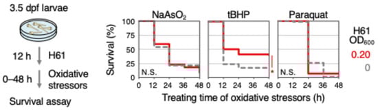 It has been previously shown that sulforaphane exhibits Nrf2-dependent antioxidant activity against another oxidative stressor, sodium arsenite (NaAsO2) [9]. The antioxidant activity of strain H61 found in this study is Nrf2-independent and acts through a different mechanism other than sulforaphane, suggesting that its activity against NaAsO2 may differ from that of Nrf2 activators like sulforaphane. Therefore, the effect of H61 pretreatment on NaAsO2 toxicity was analyzed (Figure 4). The results showed that treatment of 1 mM NaAsO2 killed about 92% of the larvae within 48 h, and pretreatment with strain H61 did not reduce this lethality (92%). Similar analyses were conducted on tert-butyl hydroperoxide (tBHP) and paraquat, other oxidative stressors used in a previously study [8] (Figure 4). Exposure to 1.25 mM tBHP resulted in about 82% larvae mortality within 48 h, while the mortality rate was reduced to 59% with H61 pretreatment. Exposure to 5.5 mM paraquat resulted in total mortality of 100% of larvae after 48 h, while pretreatment with strain H61 resulted in mortality of about 93% of larvae. In summary, H61 pretreatment mitigated the toxicity of H2O2 and tBHP but did not alleviate the toxicity of NaAsO2 and paraquat. These findings indicate that the antioxidant activity of strain H61 is not universally applicable to all oxidative stressors.