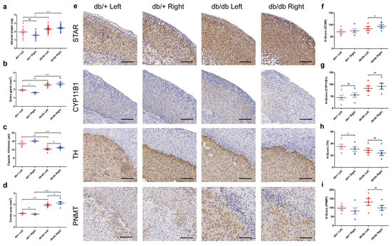 Immunohistochemistry staining was performed on the adrenal glands of db/+ and db/db mice to compare the different adrenal zones. The STAR and CYP11B1 genes act as markers for the cortex and zF, respectively, and the expression of the TH and PNMT genes help identify the medulla and mature chromaffin cells (Figure 1e). As shown in Figure 1f,g, the immunostaining H-score of the cortex marker STAR and zF marker CYP11B1 was slightly elevated in db/db mice but not statistically significant. When comparing the left and right adrenals, the expression of these cortex markers was higher in the right adrenal in db/db mice. Figure 1h,i show the immunostaining H-score of the medulla marker TH and the adrenalin-producing chromaffin cell marker PNMT. When comparing the left and right adrenals, the expression of TH in left adrenal of db/+ mice was higher, which may be linked to the neural origin of adrenal medulla. In db/db mice, the expression of both TH and PNMT was higher in the left adrenal gland.