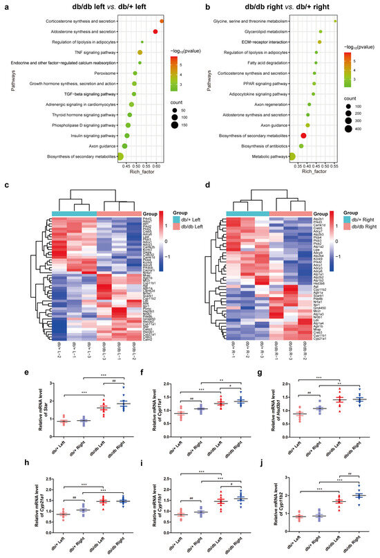 To elucidate the transcriptomic differences in the adrenals of db/+ and db/db mice, DEGs in the bilateral adrenals were identified in both mouse models. A total of 5686 (db/db left vs. db/+ left) and 5111 (db/db right vs. db/+ right) DEGs were identified comparing the same side of db/db and db/+ mice, and a total of 1577 (db/db right vs. db/db left) and 2566 (db/+ right vs. db/+ left) DEGs were identified when comparing the contralateral adrenals in db/db mice and db/+ mice, respectively, with a differential expression threshold of fold change (FC) exceeding 1.2 and a false discovery rate (FDR) below 0.001. Then, the enrichment of the KEGG pathway was conducted by comparing db/db left vs. db/+ left and db/db right vs. db/+ right, resulting in a significant enrichment of the “Corticosterone synthesis and secretion” and “Aldosterone synthesis and secretion” pathways (Figure 2a,b). DEGs in these pathways were represented as a heatmap (Figure 2c,d). A Venn diagram indicated the overlapping DEGs present in the left–right differences in both mouse models and a comparison of left–right DEGs in db/db mice versus left–right DEGs in db/+ mice revealed 467 common genes. Furthermore, pathway enrichment of these common DEGs identified a significant enrichment of pathways responsible for steroid hormone secretion, including “Corticosterone synthesis and secretion” and “Aldosterone synthesis and secretion”, as well as pathways related to protein synthesis and energy metabolism, including “Ribosome”, “Thermogenesis”, and “Oxidative phosphorylation”, which suggested lateralized asymmetries in steroidogenesis and energy metabolism in bilateral adrenals in both mouse models (Table 2). Then, various key genes involved in steroid hormone production including Star, Cyp11a1, Hsd3b1, Cyp21a1, Cyp11b1, and Cyp11b2 were validated by RT-qPCR (Figure 2e–j).