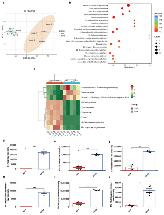 Serum metabolomics in db/+ and db/db mice. PCA plot (a), KEGG pathway enrichment analysis (b), differential metabolites in the significantly enriched pathway “Steroid hormone production” (c), and the raw intensity of significantly unregulated metabolites in this pathway, including cortisol (d), cortexolone (e), corticosterone (f), 11-dehydrocorticosterone (g), 21-deoxycortisol (h), and 17α-hydroxyprogesterone (i). The red boxes represent values in db/+ mice, and the blue box represent values in db/db mice. *** p < 0.001, unpaired t test with Welch’s correction.