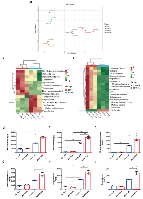 Adrenal steroid profiling. PCA plot (a) and heatmaps (b,c) of differential steroid metabolites in db/+ and db/db mice contralateral adrenals. Significant differential steroid metabolites including corticosterone (d), aldosterone (e), 11-dehydrocorticosterone (f), deoxycorticosterone (g), pregnenolone (h), and progesterone (i). The blue boxes represent the left adrenals, and the red boxes represent the right adrenals. ** p < 0.01, *** p < 0.001, one-way ANOVA followed by Tukey’s test.
