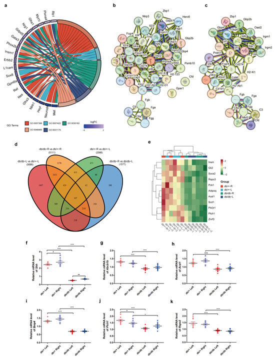 By GO enrichment of the same side of db/+ and db/db, GO:0007399, nervous system development was significantly enriched, and significantly enriched four lower levels of GO terms related to adrenal nervous system development including GO:0007422 for peripheral nervous system development, GO:0030182 for neuron differentiation, GO:0031175 for neuron projection development, and GO:0048485 for sympathetic nervous system development were collected. Then, a chord graph with 20 common DEGs between these GO terms, including Met, Neurod4, Heyl, Ntrk1, Gfra3, Nes, Ret, Gpm6a, Sox8, L1cam, Erbb2, Insm1, Phox2b, Gata3, Gdpd5, Nrg1, Gfra1, Myt1l, Plxna4, and Rb1 was presented (Figure 5a). The expression of these genes in the adrenals of db/db mice was significantly lower than that of db/+. Shh is a laterality gene that plays an important role in the embryo left–right patterning and adult adrenal stem cell maintenance [19,20]. In the present study, the expression of Shh was significantly reduced in db/db mice, as was the expression of its ligand-binding receptor gene Ptch1. In addition, the expression of Shh in the right adrenal was significantly higher than the left adrenal in both db/+ and db/db mice (Figure 5f). Furthermore, PPI networks were constructed, and the major networks responsible for “Immune system process” and “Complement and coagulation cascades” were identified by comparing the same side of the db/db and db/+ mouse adrenals (Figure 5b,c). In addition, several common DEGs derived from the Venn diagram have been linked to adrenal disorders and the development of type 2 diabetes (Figure 5d), according to the T2D Knowledge Portal (https://t2d.hugeamp.org/, accessed on 20 December 2023). These genes included Acsl1, Adipoq, Pck1, Scd1, Gli2, Znrf3, Rspo3, Socs2, Insm1, Pik3r1, and Ptch1 (Figure 5e). The expression of several of these genes was validated by RT-qPCR, and significantly reduced expression levels of these genes were observed in db/db mice (Figure 5g–k).