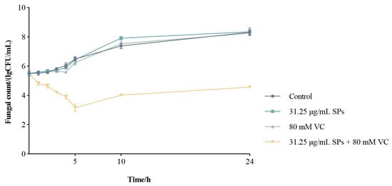 The time–kill curves (Figure 1) showed that 80 mM VC and 31.25 μg/mL theasaponins individually had little inhibitory activity against the growth of planktonic C. albicans cells. Their combination exhibited significantly enhanced inhibitory activity. The cell numbers of the combination group continued decreasing during the initial 5 h, slightly increased at 10 h, and remained steady ever after. After 24 h of incubation, the cell number of the combination group was only half of that of the other three groups.