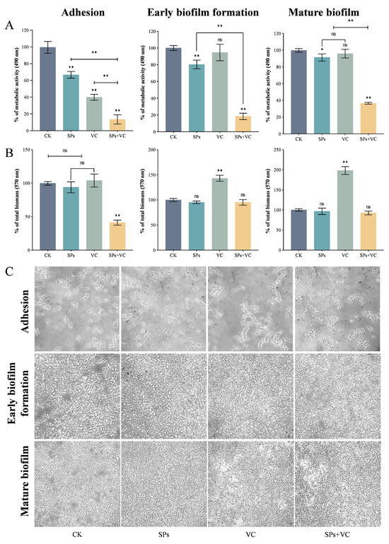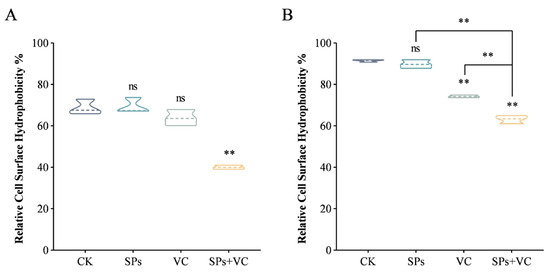 Effect of SPs and VC on the cell surface hydrophobicity of C. albicans at the adhesion stage (A) and mature biofilm (B). “**” above the column indicates significant differences (p < 0.01), and “ns” indicates insignificant differences (p ≥ 0.05).