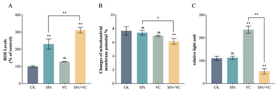 Effect of SPs and VC on (A) the intracellular reactive oxygen species (ROS), (B) mitochondrial membrane potential (MMP), and (C) intracellular adenosine triphosphate (ATP) of C. albicans. “**” above the column indicates significant differences (p < 0.01), “*” indicates significant differences (p < 0.05), and “ns” indicates insignificant differences (p ≥ 0.05).